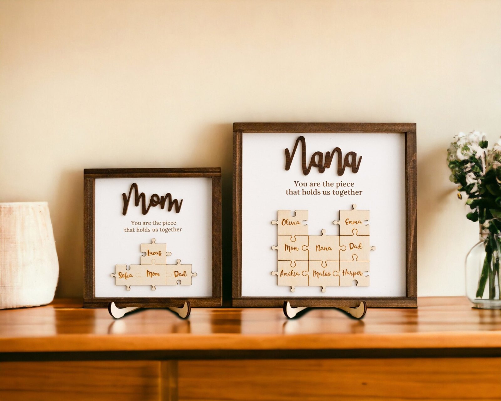 The Mama Puzzle Piece Sign is more than just home décor—it’s a symbol of love, unity, and appreciation. Designed to reflect the powerful role a mother plays in holding her family together, this handcrafted sign combines elegant design with deep emotional value. Featuring a customizable set of puzzle pieces engraved with children’s or family members’ names, this heartfelt piece is ideal for Mother’s Day, birthdays, Christmas, or any time you want to show your gratitude to the matriarch in your life.