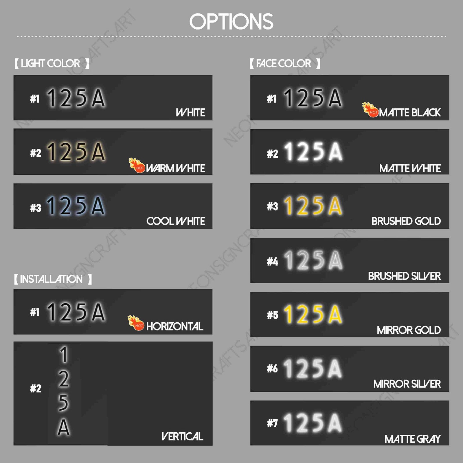 - Customization: Digits, Font, Finish, LED lighting (optional)
